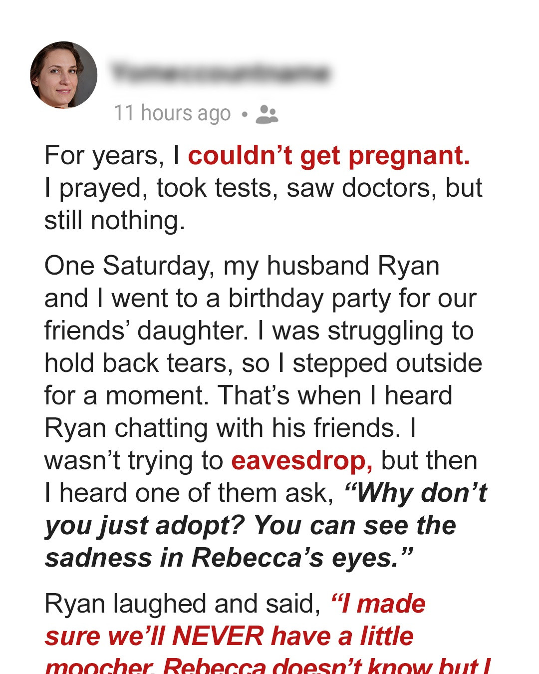 Ryan, my husband, always tried to reassure me, but I could see the disappointment in his eyes. It broke me. At a friend’s birthday party, I stepped outside to collect myself, only to overhear Ryan joking with friends about not wanting kids, admitting he had a vasectomy.