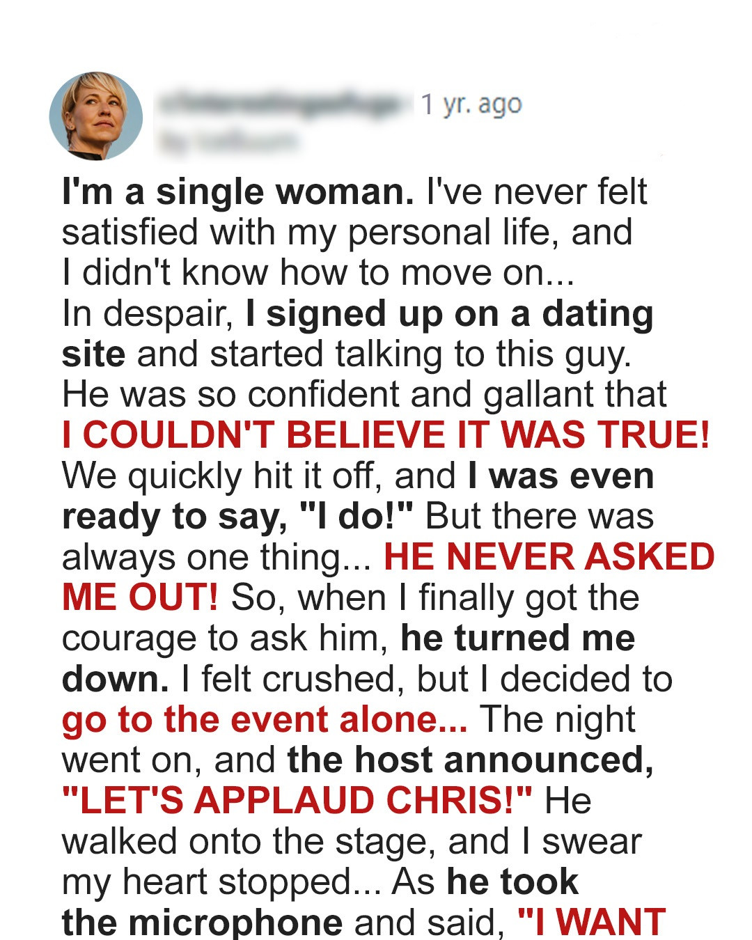 She invited him to meet at the gala, but he had a “work obligation.” Megan shrugged it off, focusing on the event. As the gala kicked off, she was busy managing details when the keynote speaker, Chris, took the stage. His confident, charismatic presence felt oddly familiar.