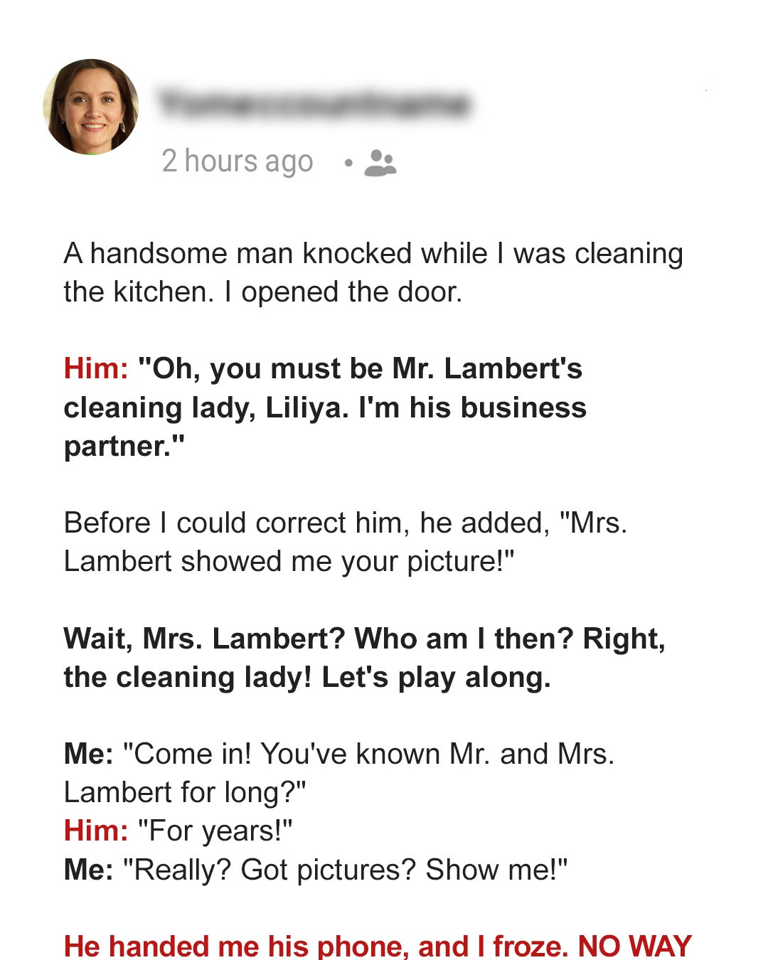 While cleaning the kitchen, the doorbell rang. I answered to find a man named David, who was looking for Mr. Lambert and assumed I was his cleaning lady. He even mentioned my picture, shown to him by “Mrs. Lambert.” I was stunned—who was this “Mrs. Lambert”?