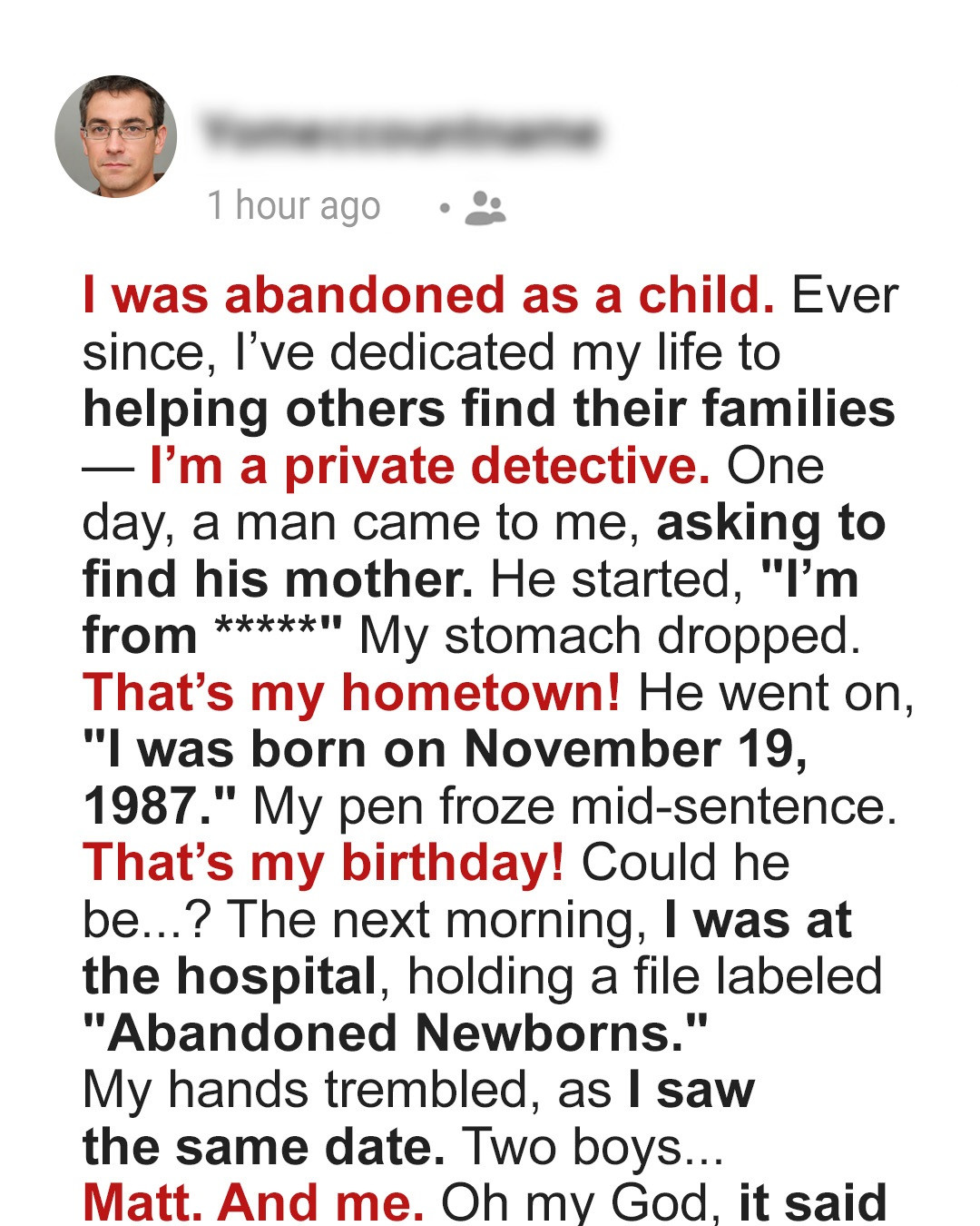 Then Matt walked in, nervous but determined. He needed help finding his biological mother, the one who gave him up. His only clues: the city he was born in and his birthdate—November 19, 1987. My stomach dropped. That was my birthday too.