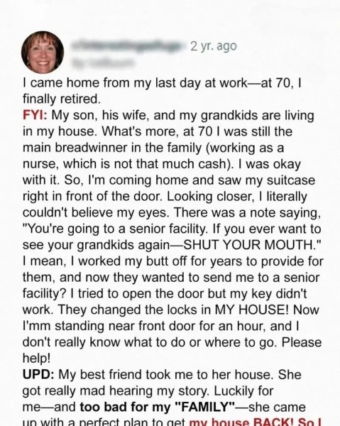 After forty years at the clinic, I retired at seventy and came home ready to celebrate—only to find my suitcases on the porch. I had lived with my son and his family for years, covering most expenses, but my daughter-in-law decided it was time for me to leave. With the help of my friend Bonnie, I uncovered her dishonesty and shared the truth with my son. In the end, I reclaimed my home and peace. Retirement became not an ending, but a fresh beginning built on respect and honesty.