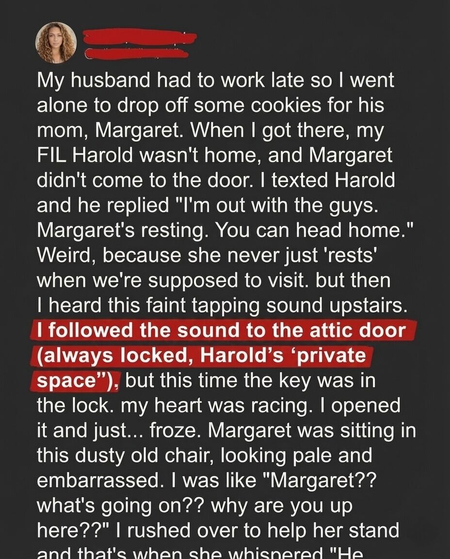 Then I heard it—a faint tapping from upstairs. Following the sound, I reached the attic door, a place Harold always kept locked. This time, the key was in it. Inside, I found Margaret sitting alone in a chair, exhausted and shaken.