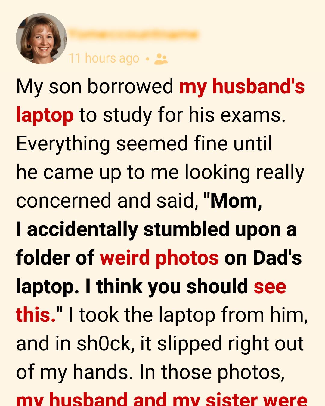 “Mom,” he said quietly, holding the laptop like it weighed a hundred pounds. “I accidentally stumbled upon a folder of… weird photos on Dad’s laptop. I think you should see this.”