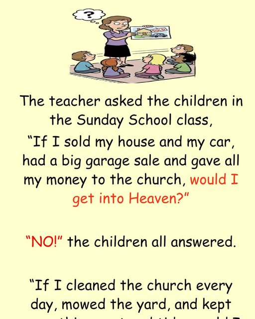 “NO!” the children all answered. “If I cleaned the church every day, mowed the yard, and kept everything neat and tidy, would I get into Heaven?”