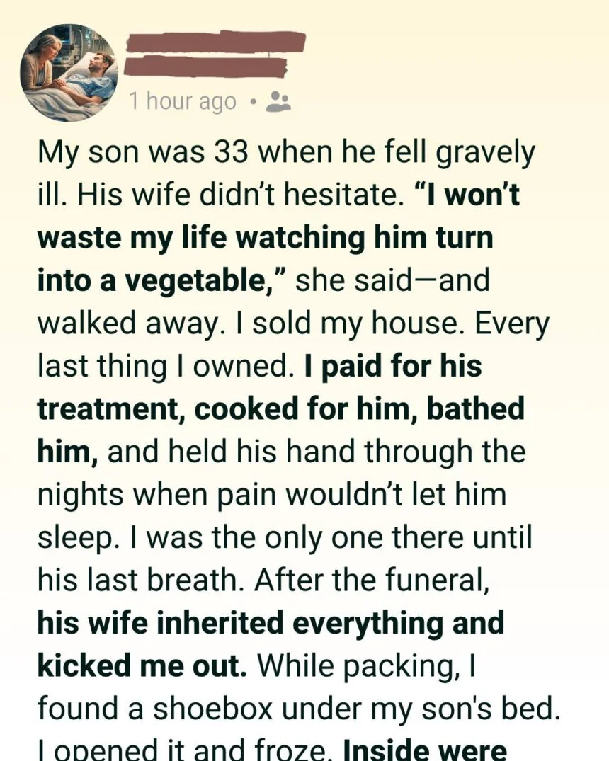 When I went under his bed to grab an old blanket he liked, my hand brushed against something hard—a shoebox pushed far back into the corner. I almost didn’t open it. Inside were documents that made my knees give out.