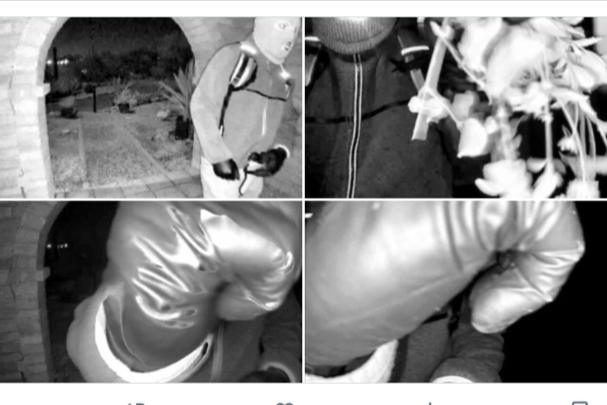 The four images show a masked individual wearing gloves and a backpack, appearing to tamper with a front-door security camera on the morning Nancy disappeared. FBI Director Kash Patel said the individual should be considered armed.
