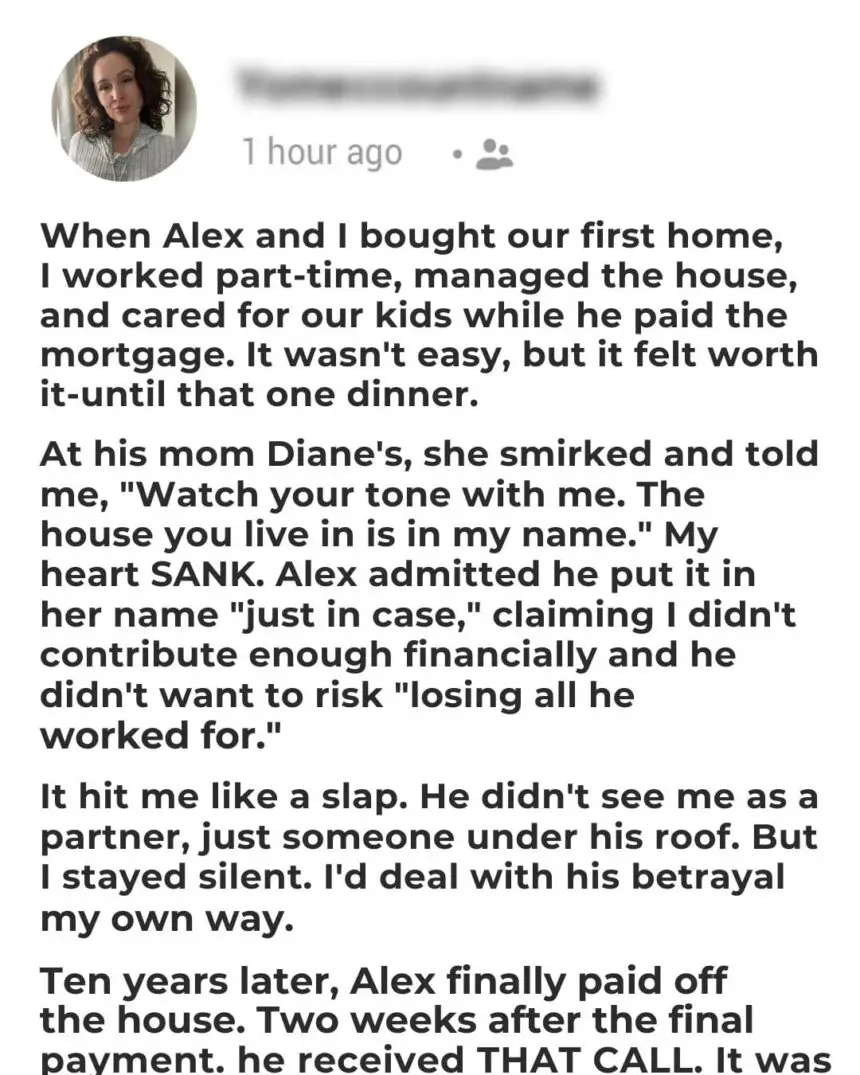 Two weeks after Alex finished paying off the house, karma struck. Diane called and announced she had signed the house over to Alex’s younger sister. Since it was legally hers, she could do whatever she wanted.