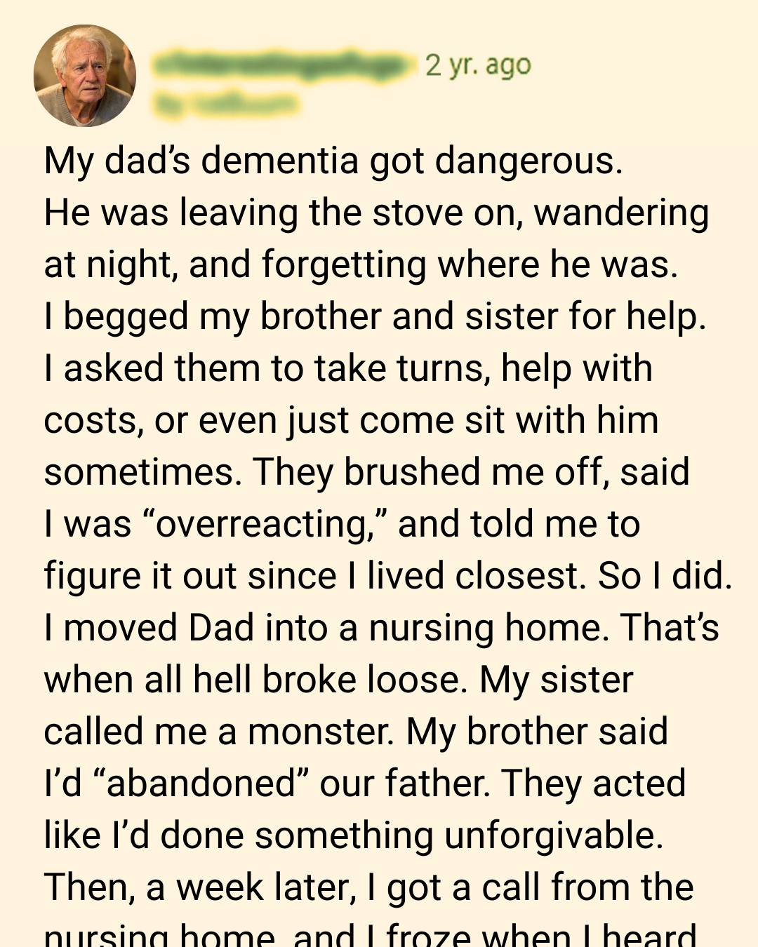 Standing in the lobby, they whispered that there was “no need” for a nursing home. That Dad would’ve been fine at home. That I’d overreacted.