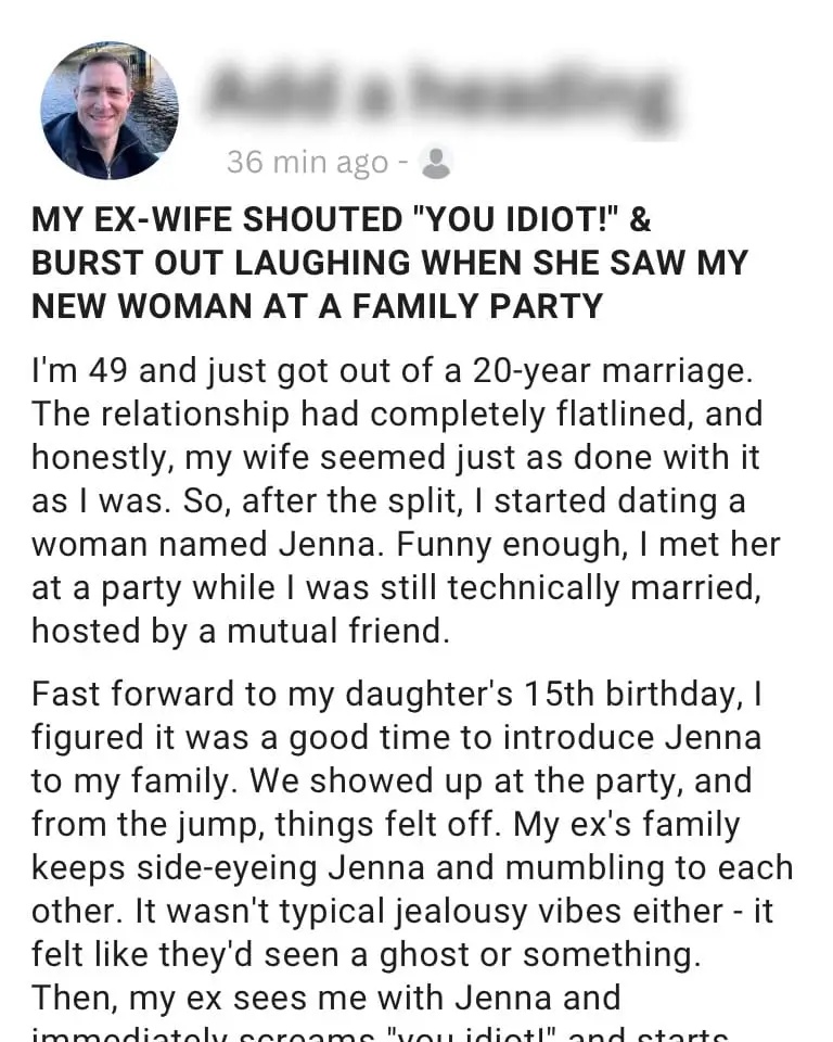 After 20 years of marriage, he felt bored and stagnant. Then he met Jenna, a woman his age who made him feel alive again. He didn’t cheat—but he chose divorce, believing he deserved a fresh start. The split was relatively amicable, though his children—19-year-old Caleb and 15-year-old Maya—were distant.