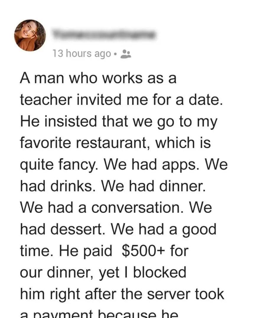 She thanked him after dinner, went home, and blocked him. According to the woman, his looking at her card ticked her off, especially since she did not want to tell him her last name.