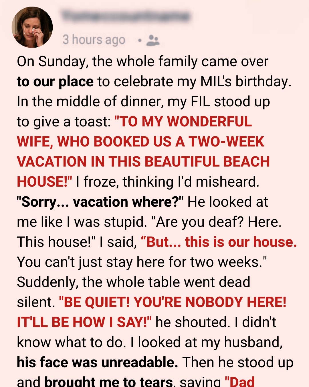 I stayed silent, feeling alone and overwhelmed, until the dinner when Carl announced they’d booked a two-week “vacation” in our house. When I protested, he humiliated me in front of everyone. That’s when Brian finally stepped in—firmly defending me, calling out his family’s behavior, and setting clear boundaries: everyone would leave that night, and no visits for months.