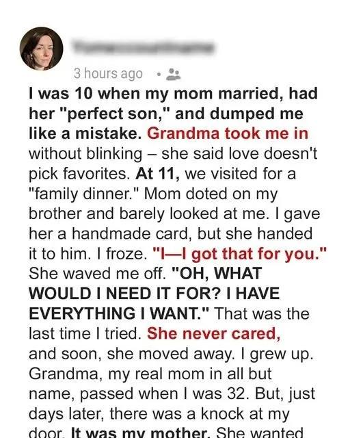 My mother didn’t even look at me. But a few days later… a knock at my door. I opened it.