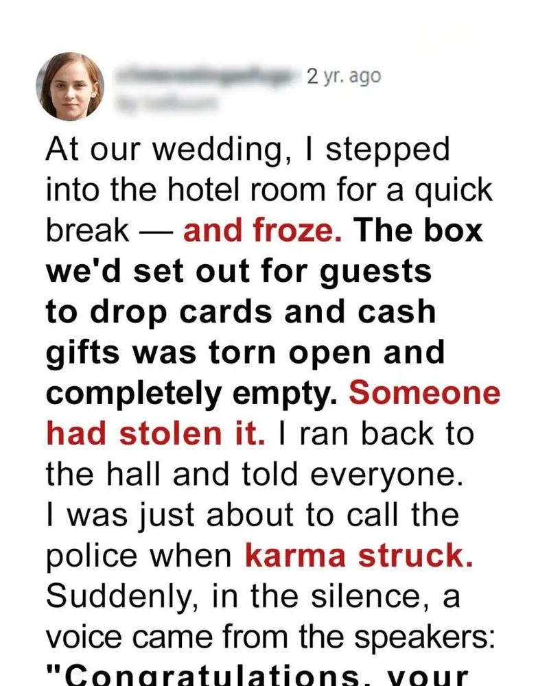 On what should’ve been the happiest night of my life, I stepped away from our buzzing reception to catch my breath and found the wedding card box, once full of cash, checks, and heartfelt wishes, ripped open and completely empty. Panic surged through me as I tried to piece together what had happened. I rushed downstairs to Joshua, and the moment he saw my face, he knew something was terribly wrong.