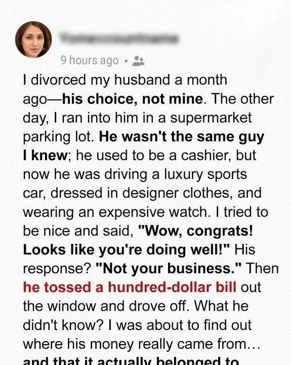 Then one evening in a grocery store parking lot, she saw him step out of a brand-new white sports car—wearing a designer suit and a Rolex. This was the same man who used to work as a grocery store cashier, living paycheck to paycheck in clearance clothes. Now he looked wealthy, confident, and smug.