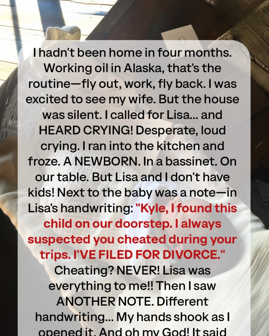 I rushed into the kitchen and froze: a newborn in a bassinet on the table. We didn’t have kids. Next to the baby was a note in Rachel’s handwriting: “Jake, I found this child on our doorstep.