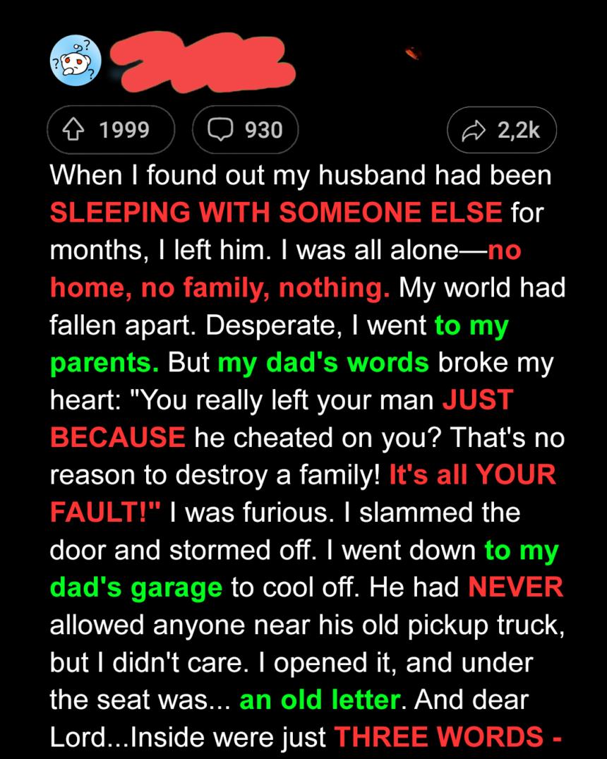 I came home heartbroken, ready for comfort. Instead, my father gave me judgment. My husband had cheated, and when I told Dad, he dismissed it: “That’s no reason to throw everything away.” Angry, I escaped to the garage.