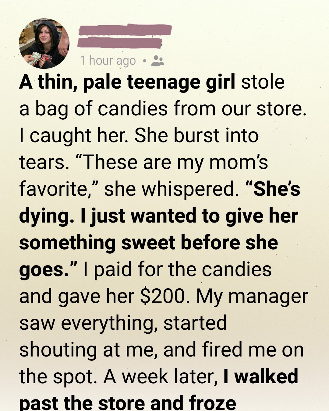 I was working a late shift in an almost empty store when I noticed a young girl, maybe sixteen, nervously standing by the candy aisle. Her hands were shaking as she slipped a small bag of candy into her pocket.
