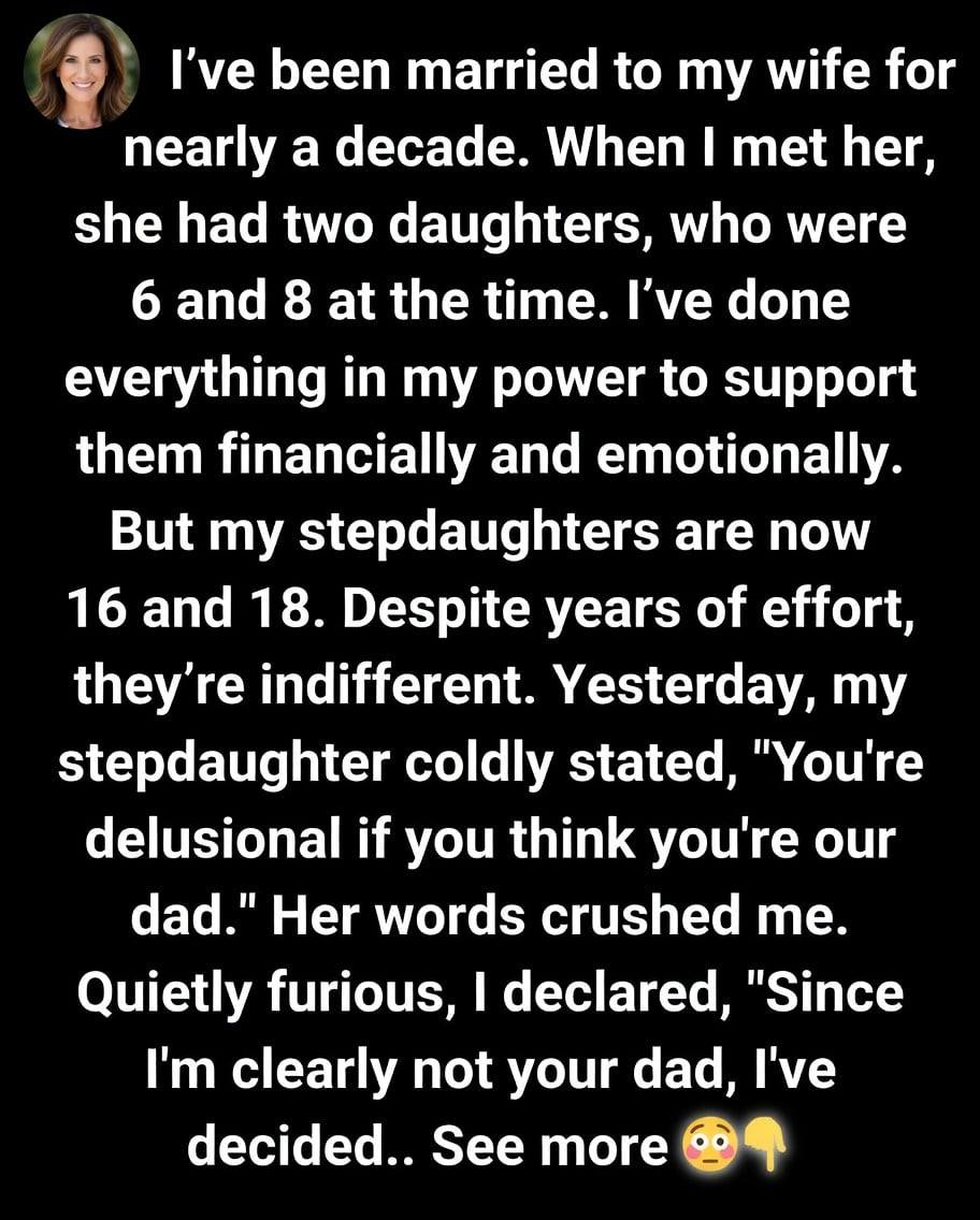 Bella stared me down and said coldly, “You’re delusional if you think you’re our dad.” Her words crushed me, and I reacted by canceling the trip, telling them, “Since I’m clearly not your dad, I’ve decided to cancel the birthday trip. It’s clear you wouldn’t want me there anyway.”