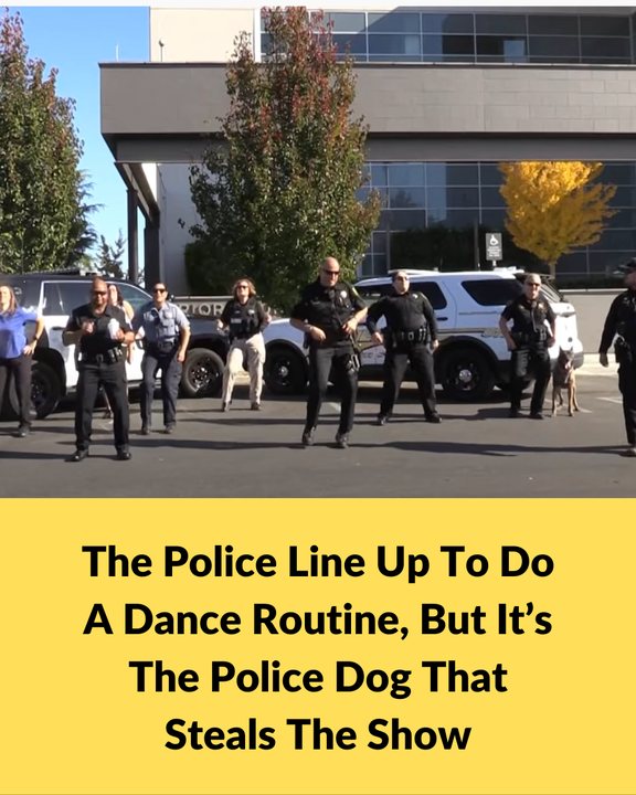 As the music plays, officers show off their moves—but the real star is the police dog, who joins in with spins and playful energy.