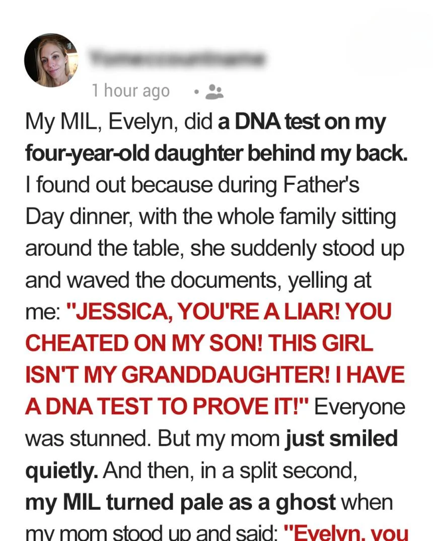 She waved a DNA test like a weapon and declared, in front of everyone, that little Willa wasn’t James’s child. The room froze. Jessica barely had time to react before her mother, Joan, calmly set down her wine, stood up, and delivered a truth Evelyn wasn’t ready for: “Of course she’s not his biological daughter.
