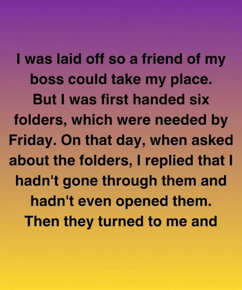 I was laid off so my boss’s friend could take my place. On Monday, he handed me six important folders due by Friday. I hadn’t opened them.