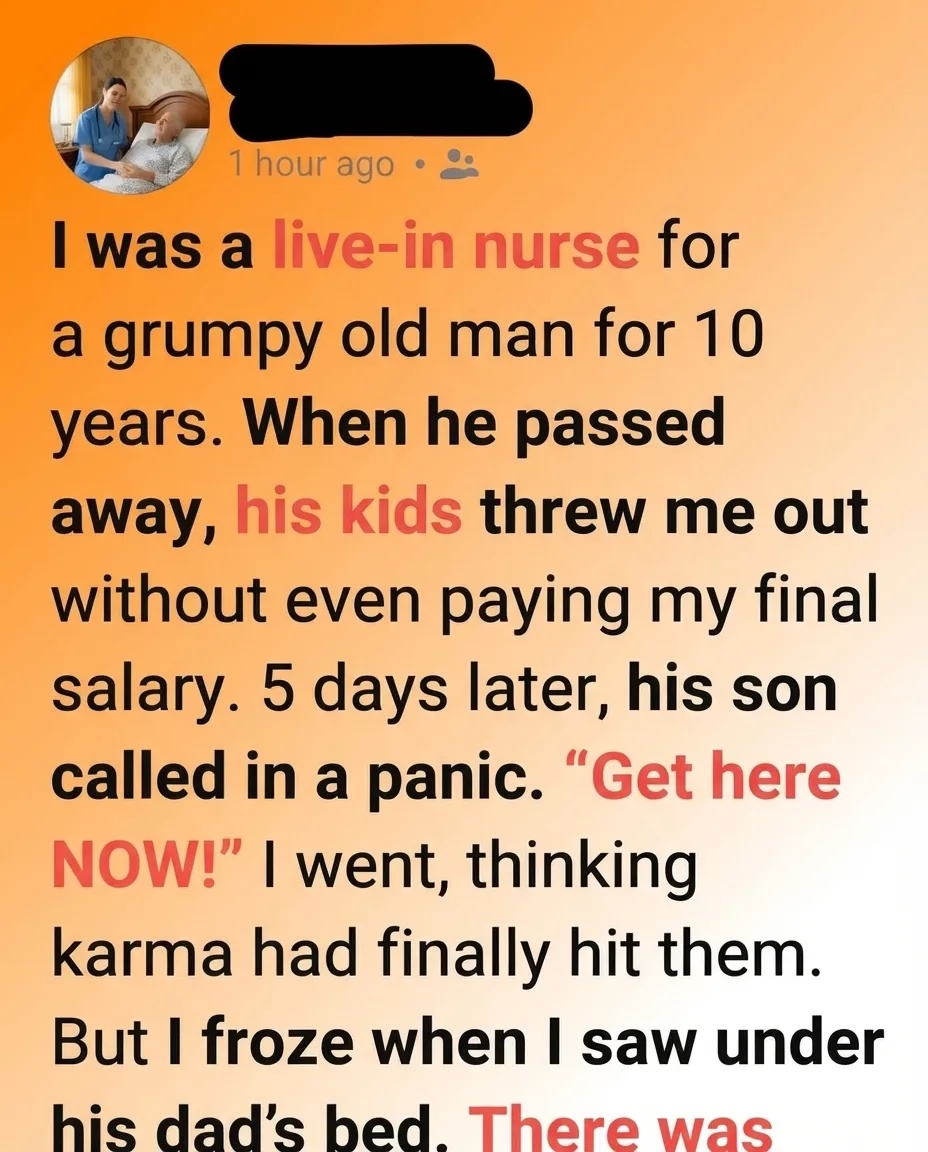 I spent ten years in Mr. Whitaker’s house, but I was never truly part of it—just “the nurse” to his children, the invisible presence moving quietly through his life while they came and went with polite indifference. He was difficult, sharp, and ungrateful in the beginning… but somewhere between his worst days and his quietest nights, something changed between us that neither of us ever said out loud.He wasn’t an easy man to care for. He complained constantly, tested every boundary, and refused help even when he clearly needed it. But I stayed anyway—through pain, sleepless nights, and moments when he pretended I wasn’t even there.And over time, the resistance faded. Not into warmth exactly… but into something quieter. Something like trust.His final days were slow and painful, stripping away everything except honesty. One night, when the house was silent, he looked at me and said, “You didn’t have to do all this.” I told him I knew. He nodded like that was the only answer he needed.Three days later, he was gone—and within hours, his children filled the house, not with grief, but with decisions. And by the second day, I was told I was no longer needed. Just like that, ten years ended in a single sentence.Five days later, they called me back. His son’s voice was different this time—tight, urgent, almost afraid. When I returned, the house felt heavier, like something unspoken was waiting in every corner.He led me upstairs to the room I knew too well… and pointed beneath the bed. Taped to the frame was an envelope with my name on it—his handwriting, unmistakable, trembling but deliberate. Inside was a letter and a key.And in those words, everything shifted: the lake cabin he always spoke about—the place he called his only peace—was now mine. Legally, completely, undeniably mine. Months earlier, he had transferred it through a lawyer, untouched and unchallengeable.