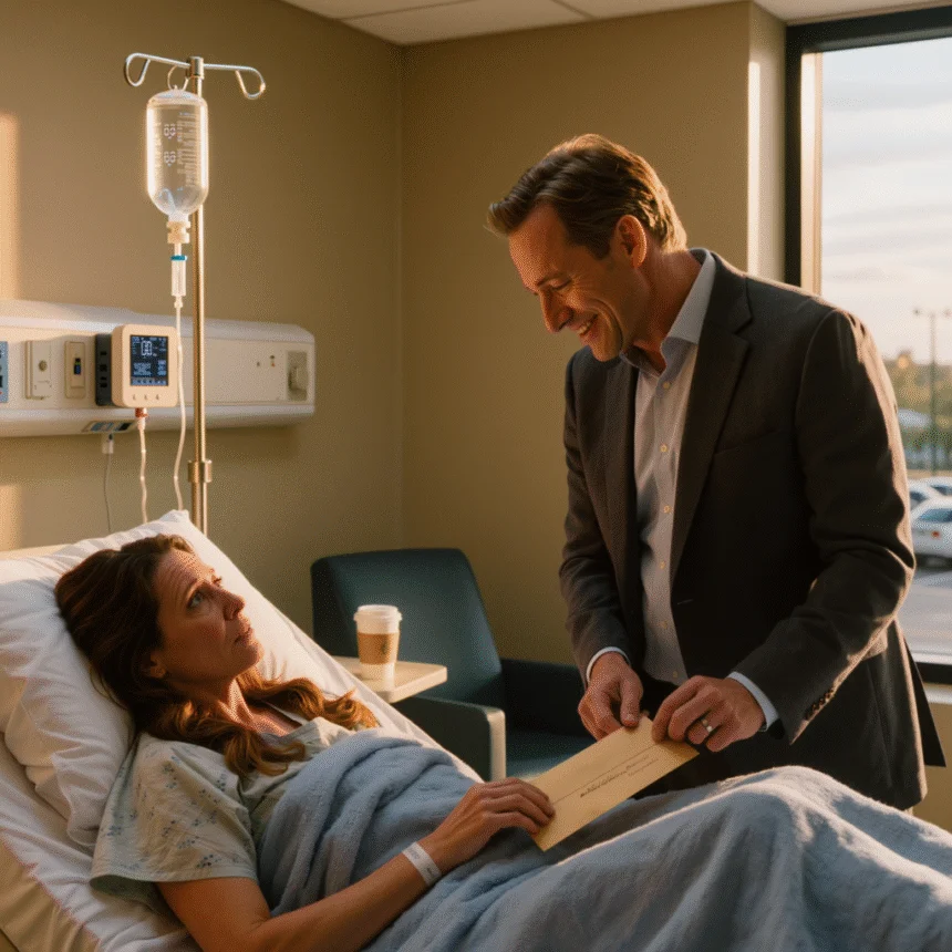 My husband of eight years. Calm, smiling, as if he’d arrived for a normal visit. No concern, no softness—just a manila envelope in his hand.
