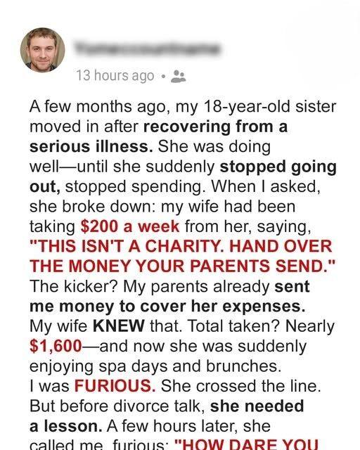 I thought I knew my wife—until my younger sister, Ava, moved in to recover from illness. At first everything seemed fine, but Ava slowly became withdrawn. When I asked, she broke down and revealed my wife, Dana, had been secretly taking her money and making her feel like a burden, even though my parents were already helping cover her expenses.