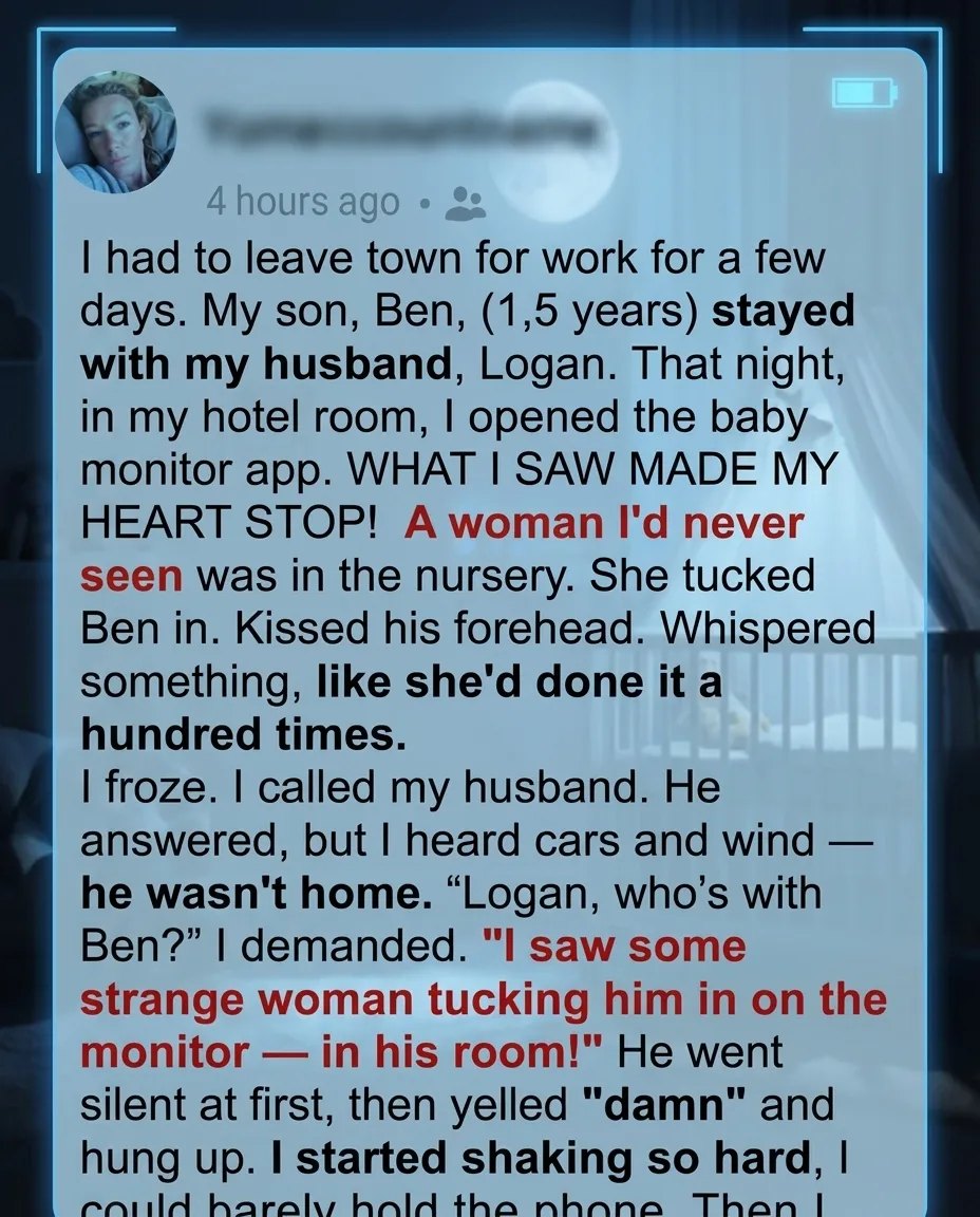 While on a short work trip, I checked the baby monitor expecting my toddler asleep—but instead, a strange woman was tucking him in and kissing him goodnight.