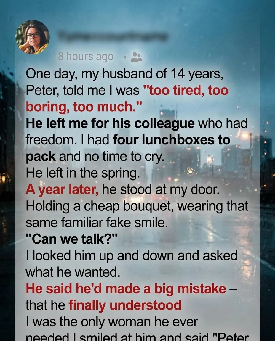 After 14 years of marriage, Peter left me and our four kids via a cold text, saying I was “too tired, boring, and too much,” and quickly moved on with his colleague. I was left to raise four children alone while he posted his “fresh start” online.