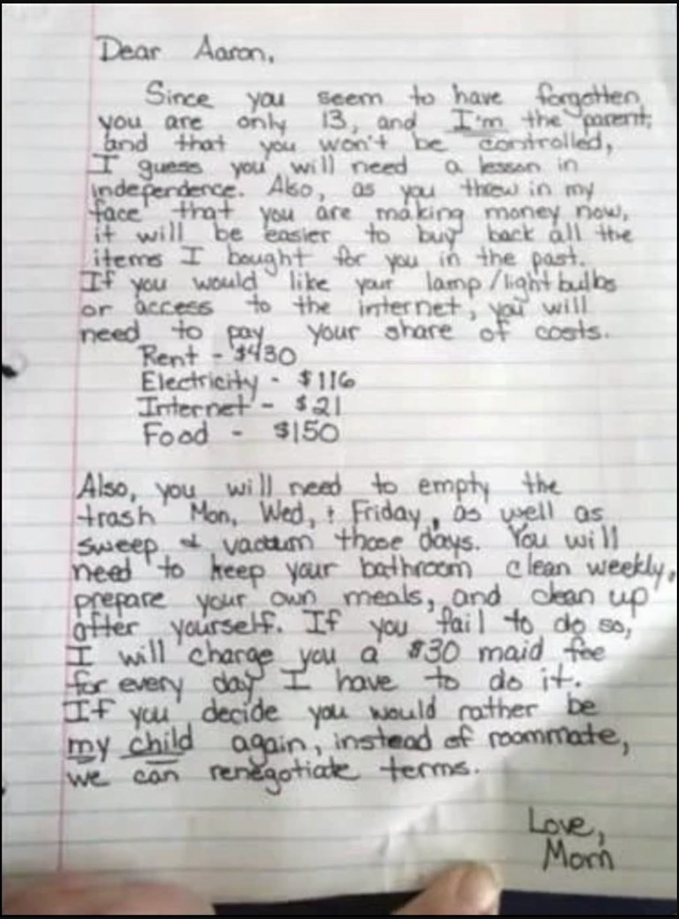 To teach him responsibility, she wrote him a “roommate contract” saying that if he wanted to live like an adult, he would need to pay rent, utilities, cook his own food, and clean his space. She signed it simply, “Love, Mom.”