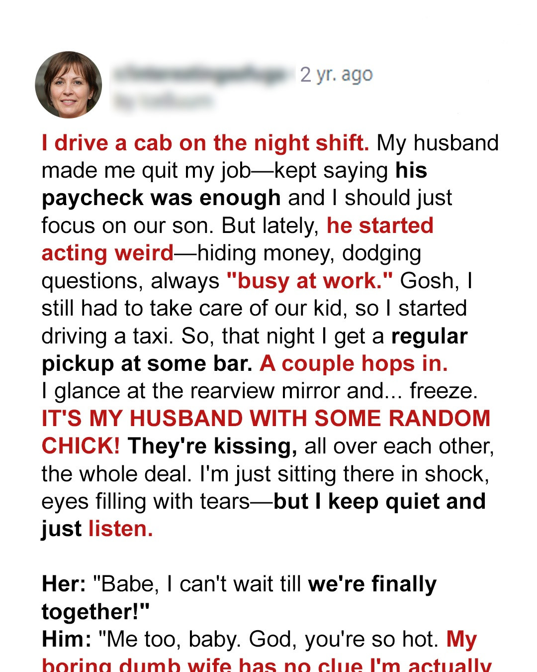 One night, I picked up a couple—Jason and his mistress. He didn’t recognize me. I listened as he promised her a fake engagement in exchange for her parents’ house—right on our anniversary. He even joked about waiting for my mom to die to get my inheritance.