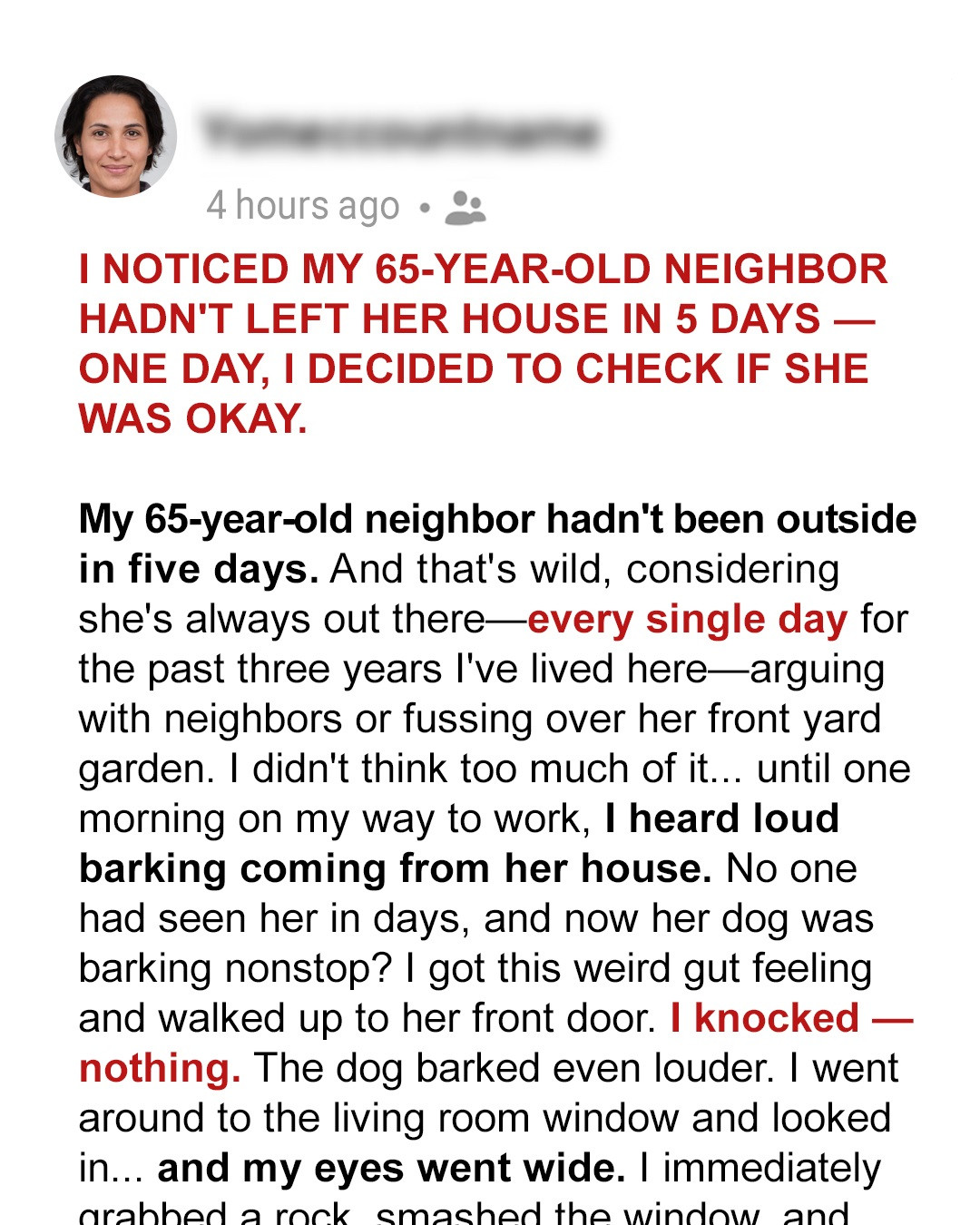 But then, I noticed the silence. No barking, no criticism. By day five, it felt eerie. When I heard her dog barking uncontrollably, I felt a gut instinct to check on her. After hesitating, I walked over, knocked, and got no response, just frantic barking. I broke a window and found her unconscious on the floor, barely breathing.