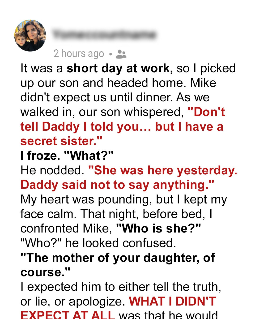 I always believed we were the perfect family—until my four-year-old son, Luke, told me he had a “secret sister.” I brushed it off as childish imagination, but his serious tone stayed with me. When I asked more, he said, “She was here yesterday. Daddy told me not to tell.”