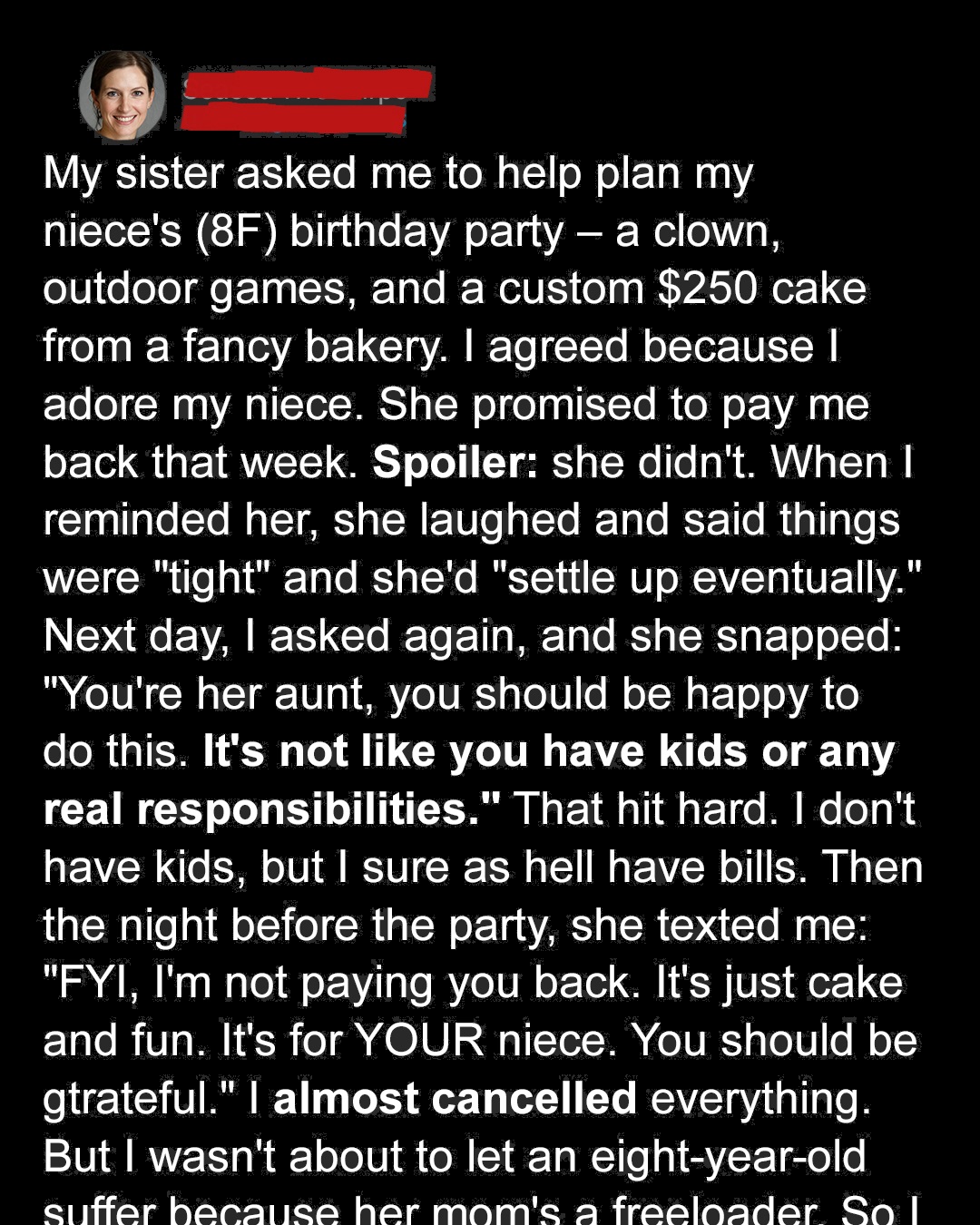 Helping family is one thing—being used is another. When my sister Hannah dumped a $250 birthday cake bill on me (plus $300 for a clown), promising to pay me back “immediately,” I should’ve known better.
